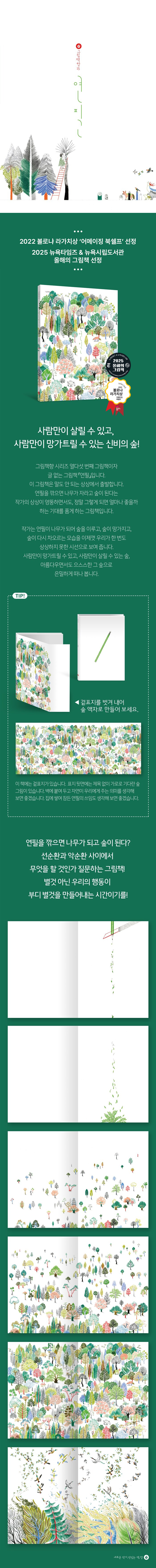 겉표지를 벗겨 내어 숲 액자로 만들어 보세요이 책에는 겉표지가 있습니다. 표지 뒷면에는 제목 없이 가로로 기다란 숲 그림이 있습니다. 이 표지를 벗겨서 벽에 붙여 두고 자연이 우리에게 주는 의미를 생각해 보면 좋겠습니다. 집에 쌓여 잠든 연필의 쓰임도 생각해 보면 좋겠습니다.