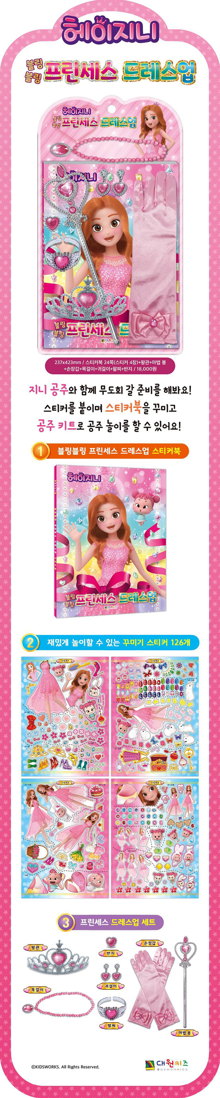 인기 유튜브 크리에이터 <헤이지니>의 캐릭터로 구성한 프린세스 세트다. 헤이지니 공주와 함께 무도회 갈 준비를 한다는 재미있는 컨셉으로 마법봉, 손장갑, 왕관, 팔찌, 반지, 귀걸이까지 함께 들어있다. 또한 스티커북에는 스티커 6장으로 스티커로 예쁘게 꾸미고 색칠까지 할 수 있다.