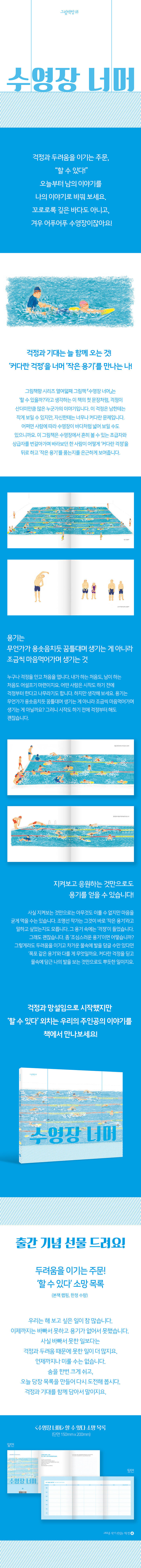 용기는 무언가가 용솟음치듯 꿈틀대며 생기는 게 아니라 조금씩 마음먹어가며 생기는 것 수영장에 갑니다. 아이는 처음 가는 수영장이지만 낯선 환경에 조금씩 적응하며 수영을 즐깁니다. 한편 수영장이 훤히 보이는 유리창 안쪽 대기실은 수영하는 사람들을 볼 수 있는 곳입니다. 아이인지 어른인지는 모르지만 바로 그곳에서 수영장을 바라보는 어떤 한 사람이 바로 ‘말하는 이’입니다.
