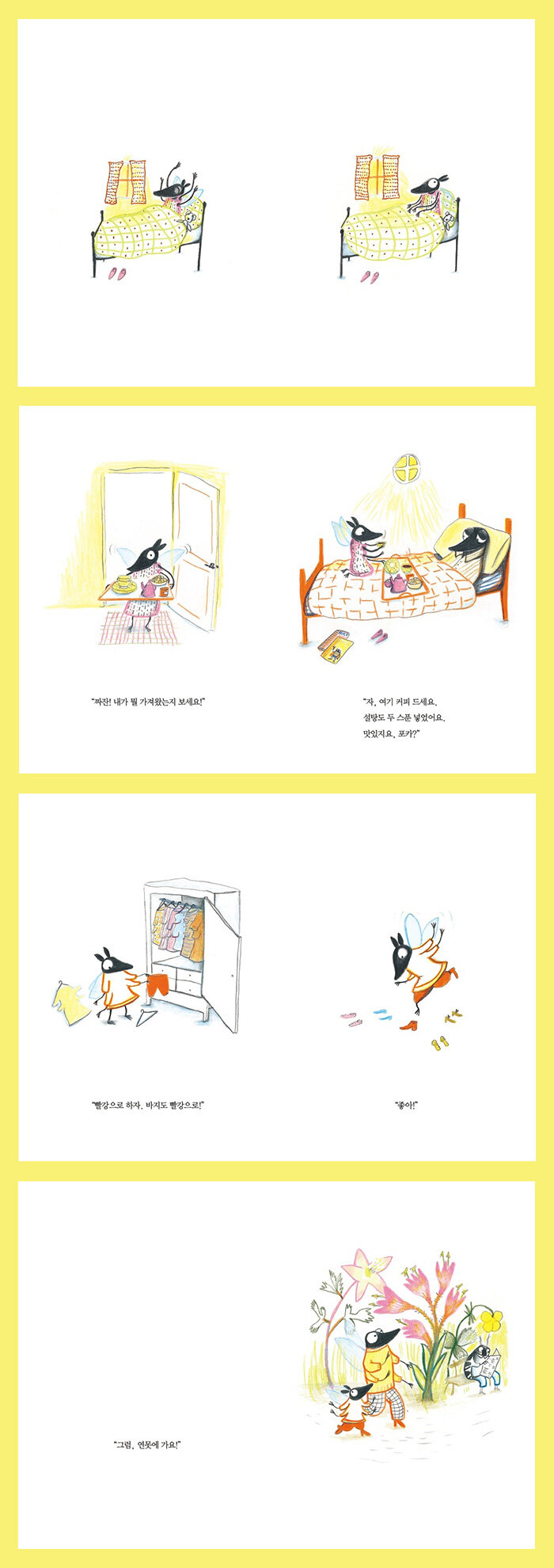 《포카와 민 시리즈》 첫 번째 이야기입니다. 여섯 개의 발이 달린 곤충, 포카와 민을 주인공으로 어린이에게 일어날 수 있는 소소한 일상을 다루었으며, 한부모 가족, 성평등, 고정관념과 편견 등 다양한 주제들을 이야기합니다. 《포카와 민 시리즈》는 키티 크라우더 작가가 11년 동안 쓴 그림책 시리즈로 총 8권(《일어나요!》, 《새로운 날개》, 《박물관에서》, 《영화관에서》, 《정원에서》, 《축구》, 《낚시하러 가요!》, 《할머니를 위한 선물》)으로 구성되었습니다.