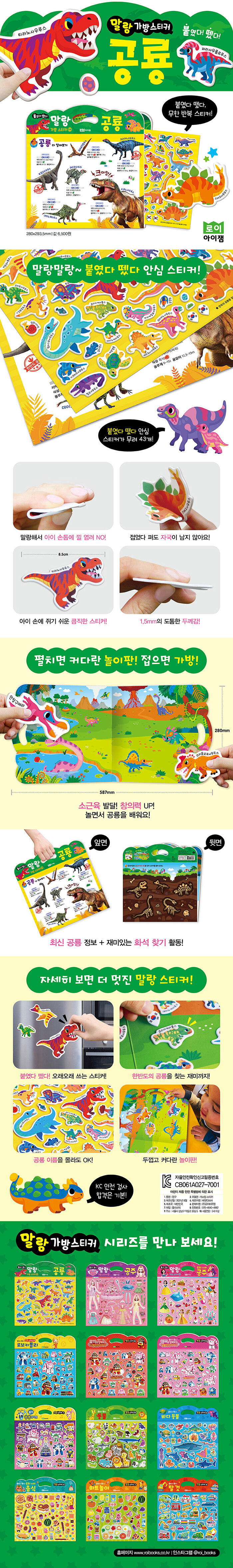 아이들이 좋아하는 스티커를 반영구적으로 사용할 수 있는 재미있고 실용적인 스티커북이다. ‘공룡’ 편에서는 티라노사우루스, 트리케라톱스, 파키케팔로사우루스 등 아이들이 좋아하는 다양한 공룡 스티커를 만날 수 있다. 공룡뿐만 아니라 익룡, 수장룡, 파충류 스티커도 함께 구성되어 있다. 스티커를 여러 번 붙였다 떼며 소근육운동능력이 자연스럽게 발달되고, 최신 공룡 정보와 화석 찾기 등 재미있는 활동으로 과학적 호기심과 상상력이 쑥쑥 자란다.