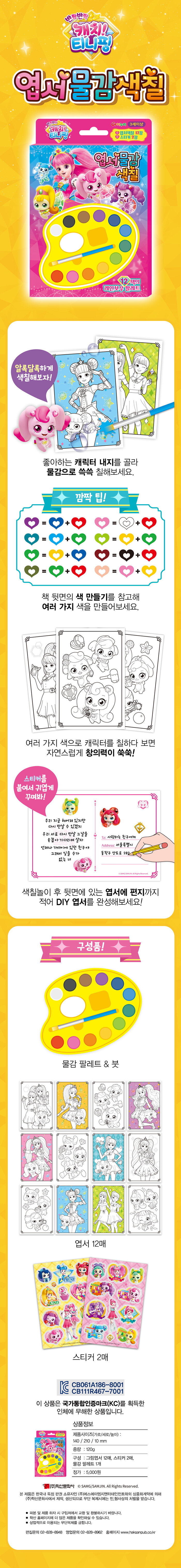12가지 색깔의 물감과 붓이 들어간 만능 팔레트! 아이가 좋아하는 캐릭터를 다양한 색상으로 색칠놀이할 수 있다. 펜이 아닌 붓으로 내가 원하는 색을 만들어 색칠하면서 집중력과 창의력을 기르며 색에 대한 다양한 경험을 할 수 있어 미술적 색채감각을 키울 수 있다. 색칠놀이 뒷면은 엽서로 구성되어 있어, 세상에 하나뿐인 예쁜 엽서를 만들어 소중한 친구에게 선물할 수 있다. 다양한 스티커 2매까지 들어있어 더욱더 예쁘게 꾸밀 수 있다.