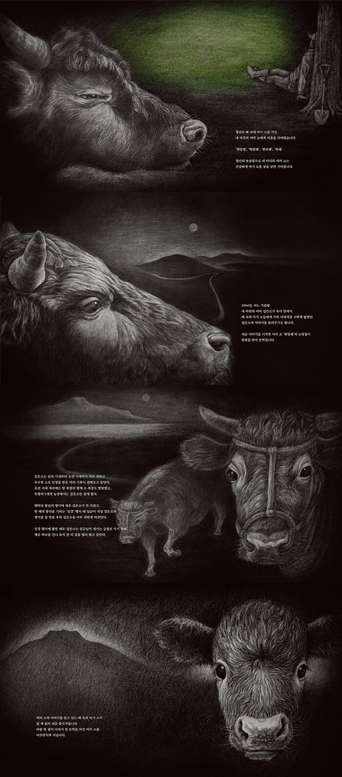 네 마리의 어미 검은소는 축사 안에서 배 속의 아기 소들에게 거의 사라져갈 수밖에 없었던 검은소들의 험난하고도 고달픈 역사를 들려주기로 한다. 삼국 시대와 조선 시대 그리고 근대에 이르기까지, 세기를 아우르는 기나긴 세월에 걸쳐 받은 핍박에는 멸종 위기까지 갔었던 검은소들의 애환이 서린 이야기가 담겨 있다. 제주의 사람들과 사건에서 늘 자리를 함께해 온 검은소의 이야기를 둘러싼 구체적인 이야기를 만나보자. 세밀한 붓질이 더한 검은소 그림은 작품의 여운을 더해준다.