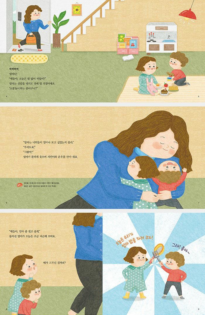 “삑삑삑삑. 늦은 저녁 현관문을 여는 소리가 들려요. 지민이와 준우는 직감으로 엄마라는 걸 알아차리죠. 늘 이 시간이면 엄마가 집에 오니까요. 엄마는 지민이와 준우를 꼭 안고 하루 안부를 물으며 하루 종일 엄마를 기다렸을 아이들을 위로해 줍니다. 그런데 아이들도 피곤해 하는 엄마를 위로해 주고 싶은 마음이 들었나 봐요. 지민이와 준우는 엄마를 위해 맛있는 저녁을 차려 주기로 합니다. 가지고 놀던 소꿉놀이 장난감으로요! 지민이와 준우는 소꿉놀이 장난감으로 어떤 요리를 해서 엄마를 놀라게 해 줄까요?”